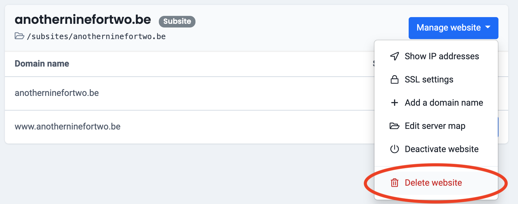 - Here, find the website (subsite) you want to remove and click on the “Manage website” to open the context menu and click on “Delete website”.