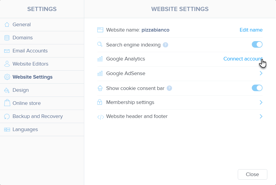 How to Add Google Analytics Code to Your SiteBuilder Website Click Settings.In the Website Settings tab, click Connect account.Enter your Google Analytics Tracking ID and click Save.Publish the changes. Updated on 28 September 2022 Was this article helpful? Yes No