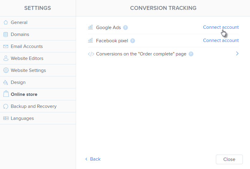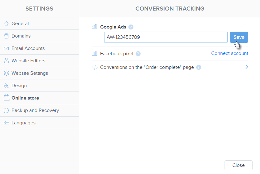 For Google Ads and Facebook pixel, enter the tag ID. If it is another service, enter the complete code in the third field Conversion on the “Order complete page“. More details below.