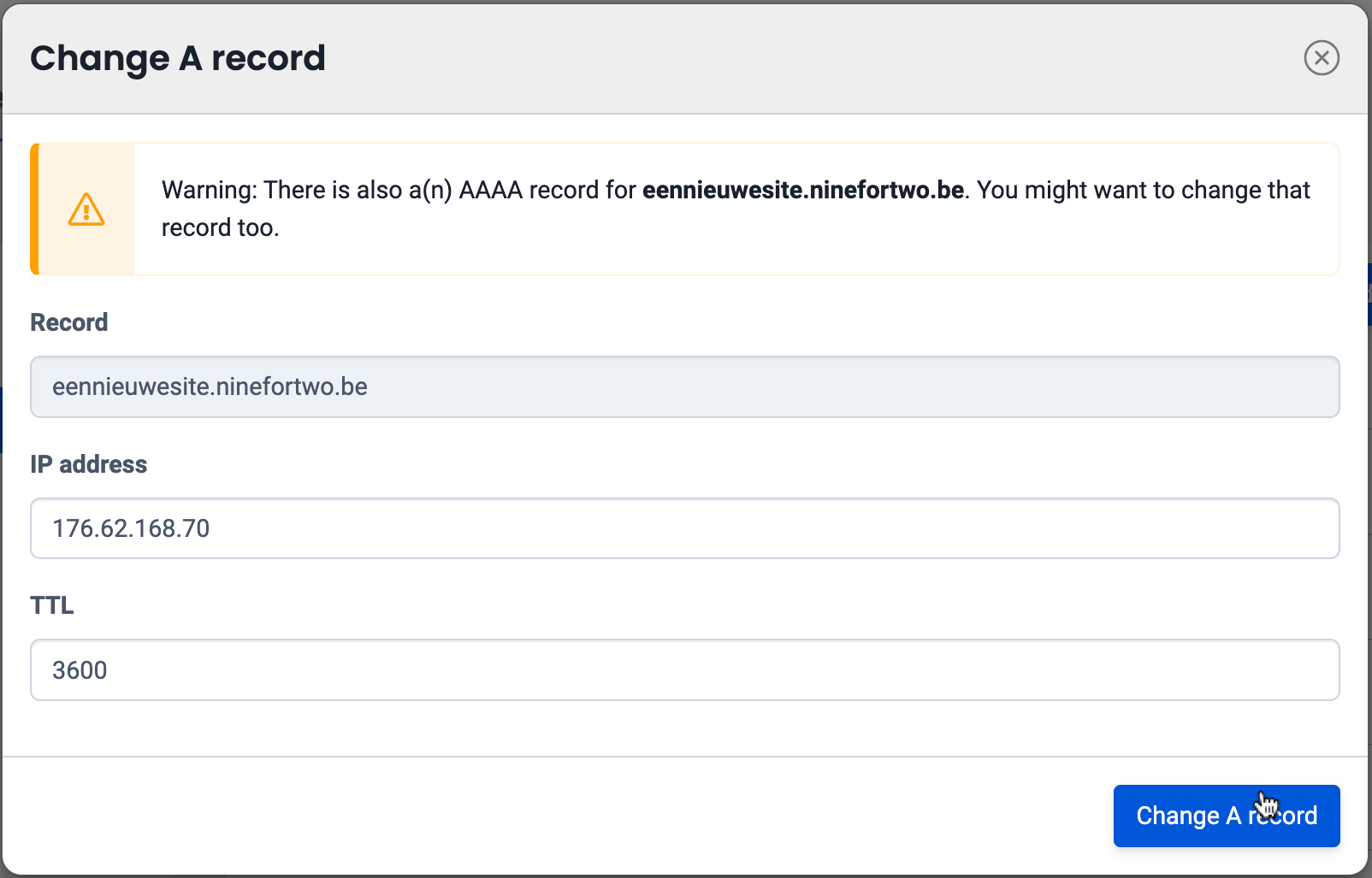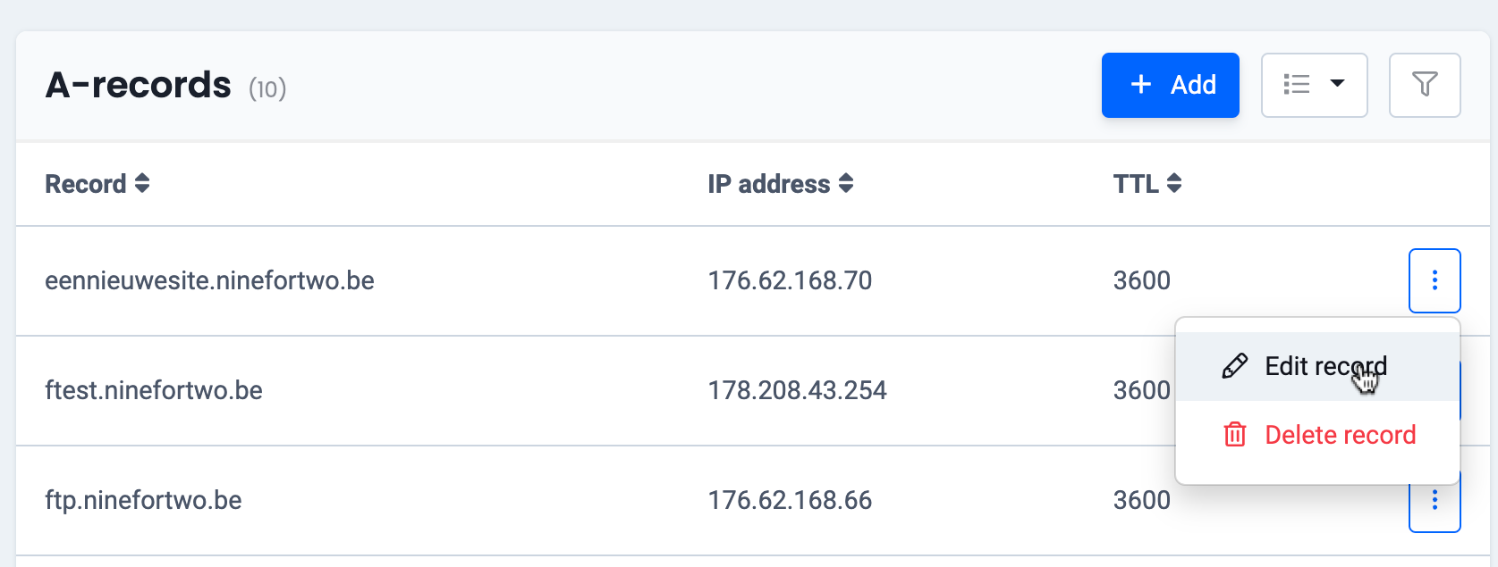 - To change an existing A-record , choose the host that you want to change and click on the three dots to the right and then on “Edit record”.