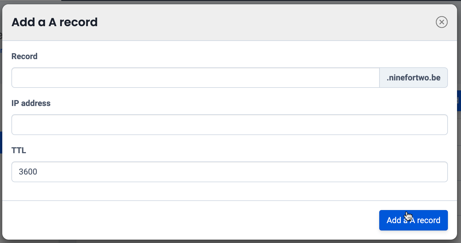 Add a new A-record by clicking on “+ Add” at the top. Give a name to the subdomain in the left text field or leave it blank if you want to create the A-record for the domain name itself.