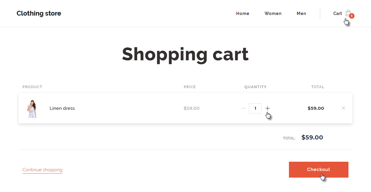 - To see what they have in their cart, your customer can click Cart in the upper corner of your store. Once on the cart page, your customer can change the quantity of the product or remove it from the cart. They can order the product(s) by clicking Checkout.