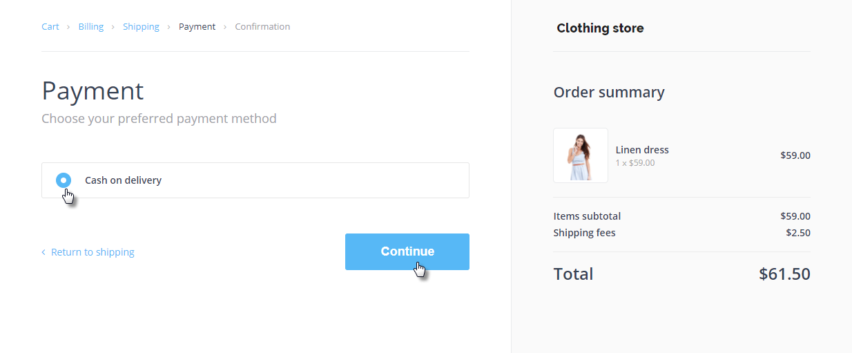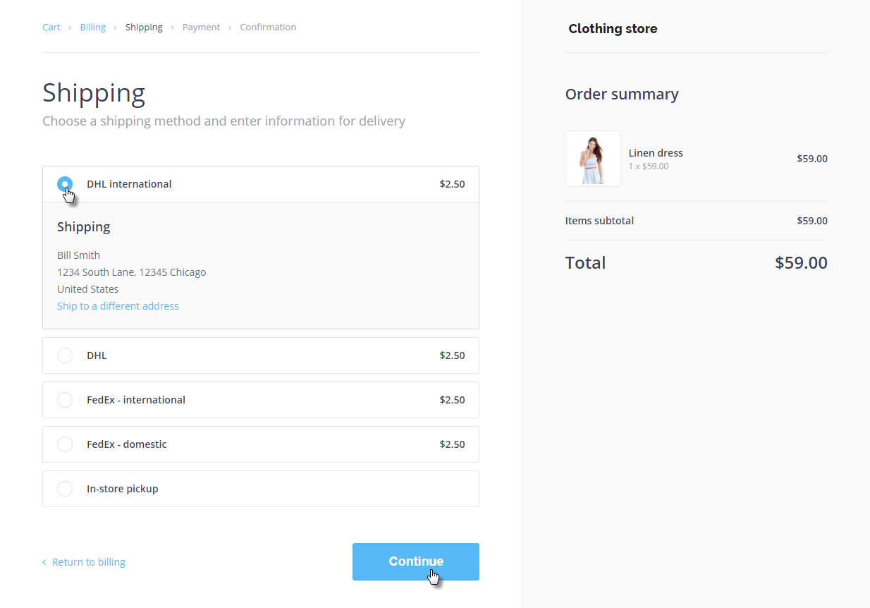 - Your customer will then be lead to the next screen where they will choose their shipping method. The price for their chosen method will automatically be added to the price of the goods. On the right side of the page, your customer will see the total price of their order. After they choose the shipping method, they will continue their purchase by clicking Continue.
