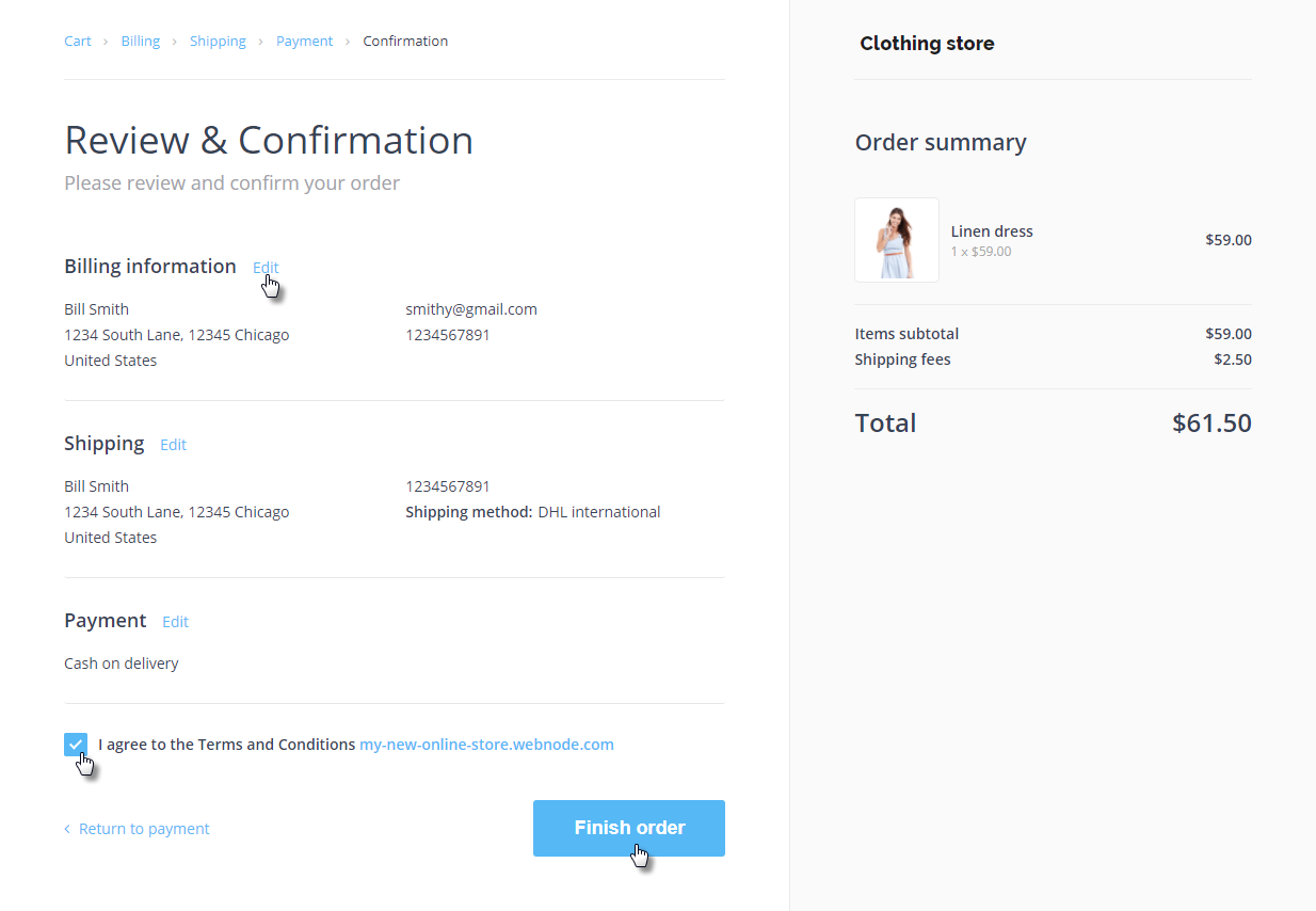 - The next screen will allow your customer to check over their order. They can check their contact details and shipping and payment methods. If there is a mistake, they can click Edit to change the information. If everything is correct, your customer can send the order after checking the I agree to the Terms and Conditions box and then clicking Finish order.