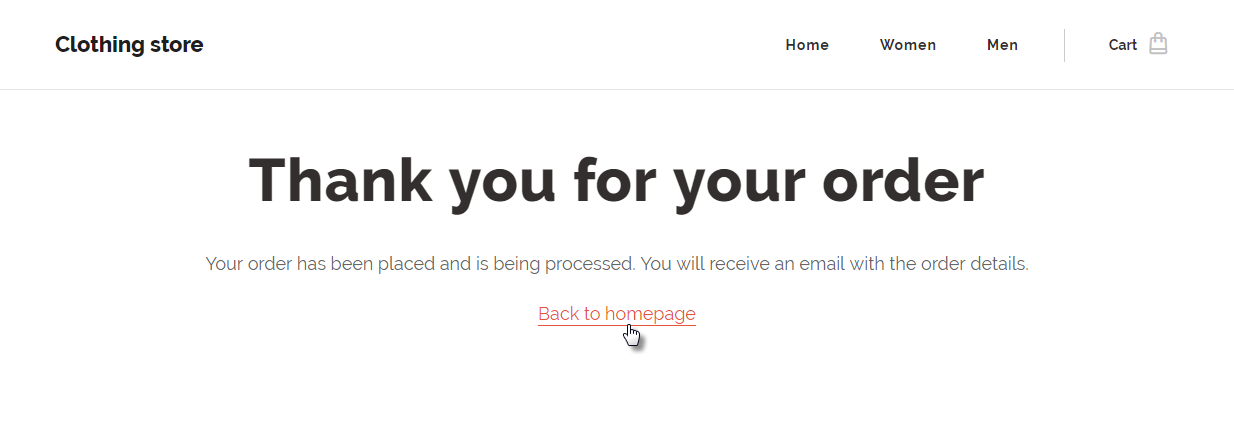 - Your customer has now sent their order and will be shown a window with your thank you message. They can then navigate back to your online store by clicking the link Back to homepage.