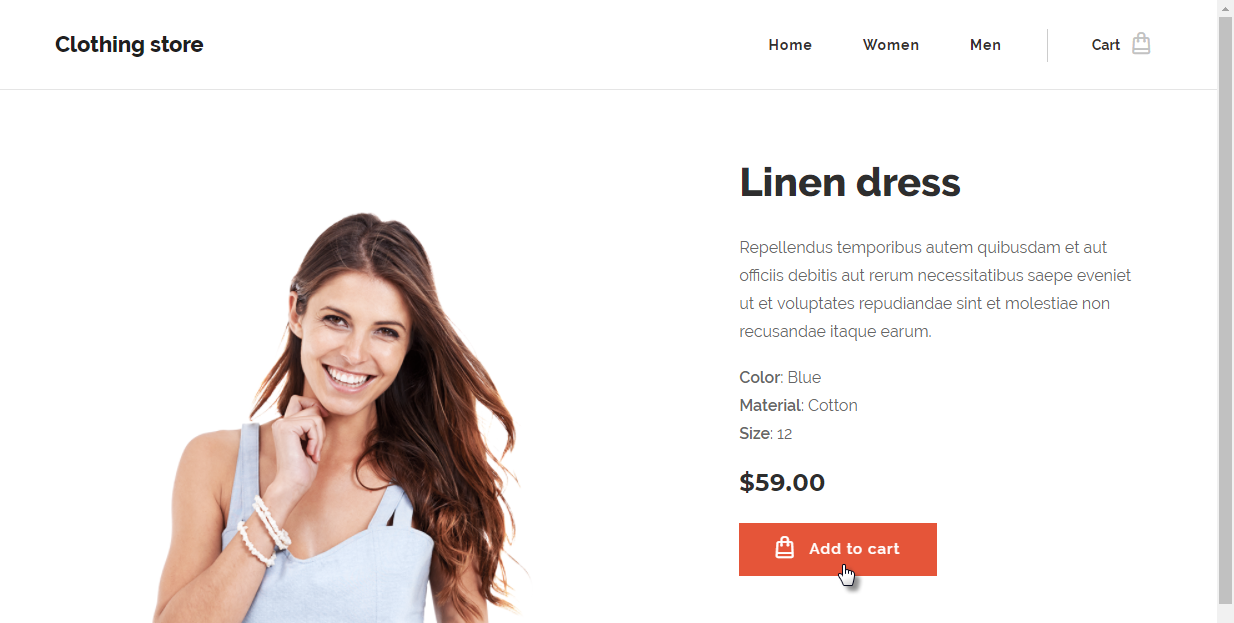 - If they happen to find a product they are interested in, they click on it. They will be taken to the product’s detail page where they can see images of the product, a more in-depth description or any other information you added for the product. If they decide to purchase, they click the button Add to cart.