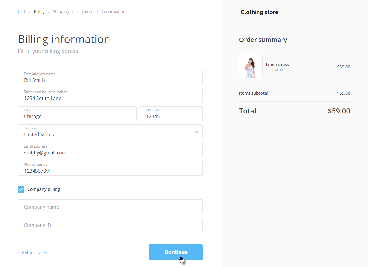 - Next, your customer will need to enter their billing information. If they are purchasing for their company, they can click Company billing and enter the information needed. Go to the next step by clicking Continue.