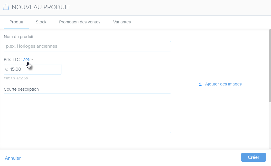 - Entrez le nom du produit et son prix. Vous pouvez aussi modifier le taux de TVA.