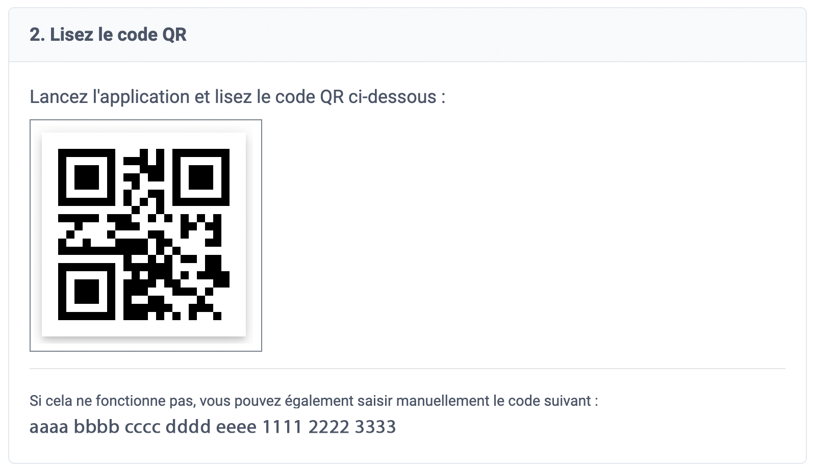 - Vous trouverez un code QR que vous devrez lire avec votre appareil pour pouvoir configurer l’application. Si la lecture du code ne fonctionne pas, vous pouvez également saisir une séquence alphanumérique dans votre application.