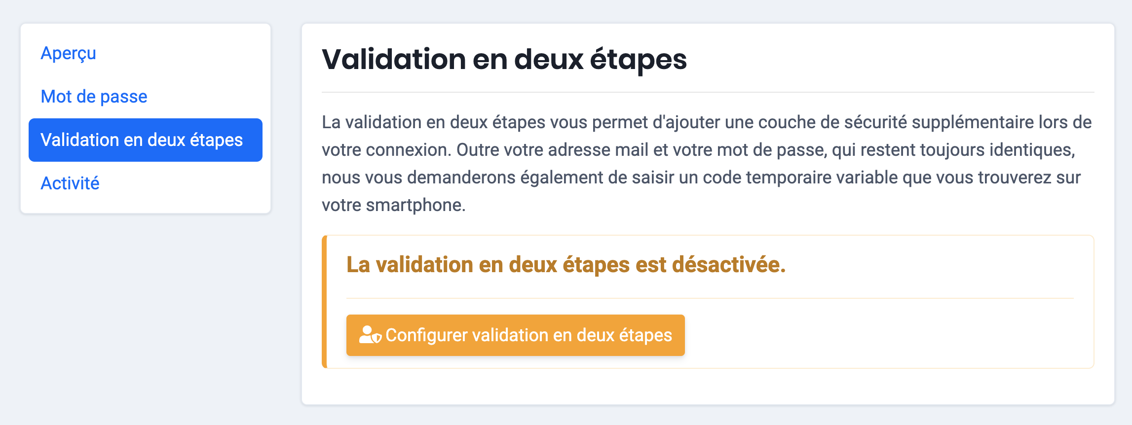 Avec la validation en deux étapes, vous ajoutez une couche de protection supplémentaire pour votre accès. Sur votre smartphone, vous recevrez un code que vous devrez entrer pour vous connecter. Ainsi, votre compte est encore plus sécurisé.