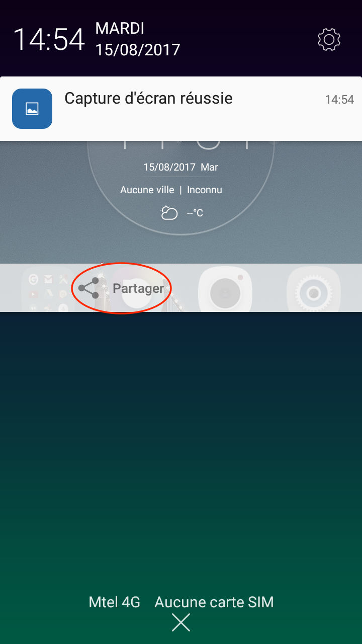- Pour envoyer le fichier juste après avoir réalisé la capture d’écran, faites apparaître le panneau de notifications. Tapez sur « Partager » pour l’envoyer via e-mail.