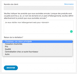 - Dans le deuxième champ, spécifiez le produit que vous souhaitez résilier. Dans la raison de la résiliation, choisissez l’option qui vous convient le mieux dans le menu déroulant.