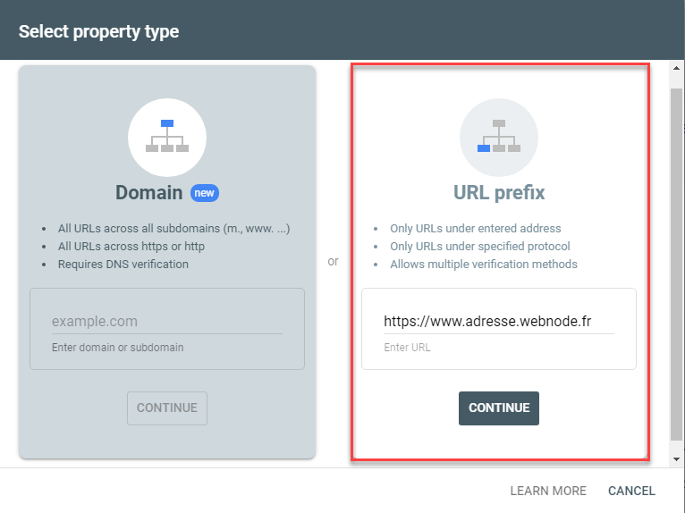 Vous devez répéter l’opération pour chaque version de votre domaine séparément. Après avoir saisi l’adresse de votre site web, cliquez sur le bouton Continuer.Conseil :Pour en savoir plus, consultez le centre d’aide Google Search Console.
