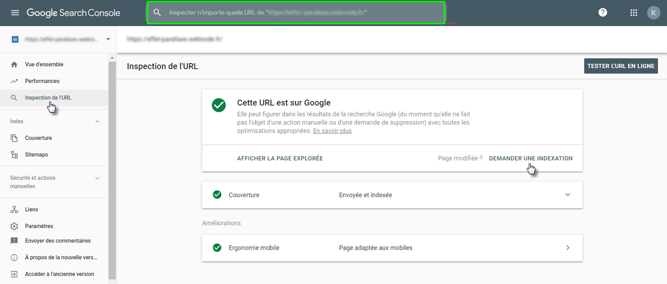 - Connectez-vous à votre compte Google Search Console et cliquez sur l’onglet Inspection de l’URL.