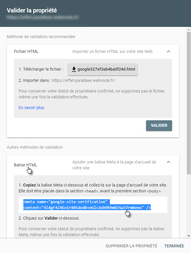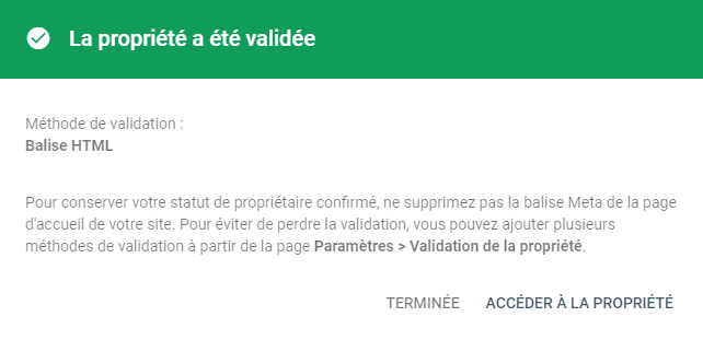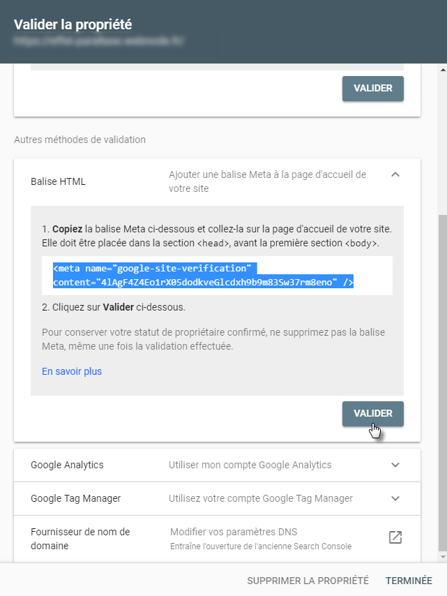 - Cliquez sur le bouton VALIDER dans votre compte Google Search Console.