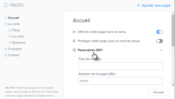 - Sur la page d’accueil, cliquez sur Paramètres SEO.