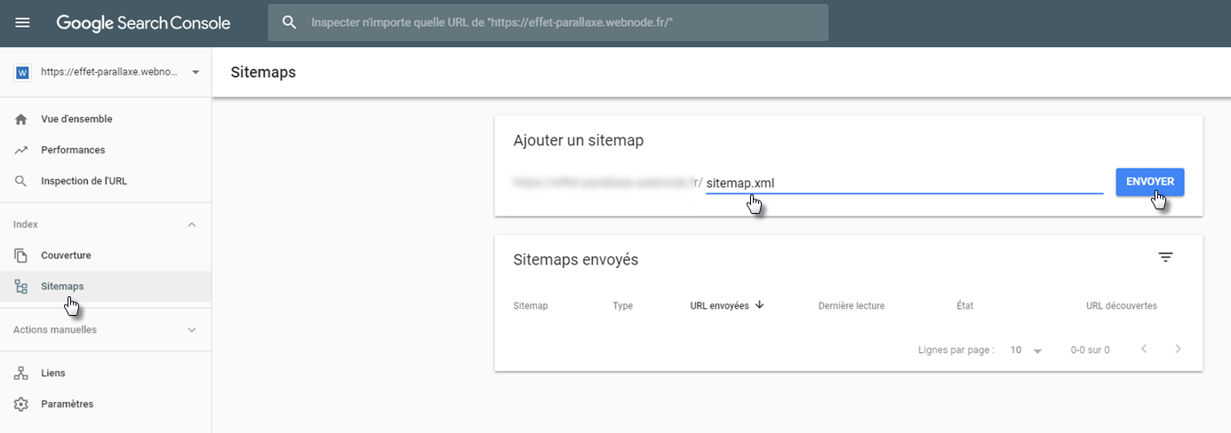 - Cliquez sur « Sitemaps » sur le tableau de bord. Ajoutez sitemap.xml à la fin de l’adresse de votre site web. Cliquez sur ENVOYER.
