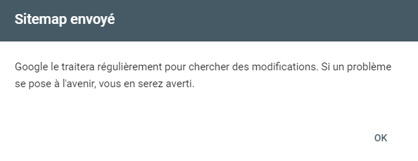 - Le message vous informant que le sitemap a été envoyé à Google s’affichera.