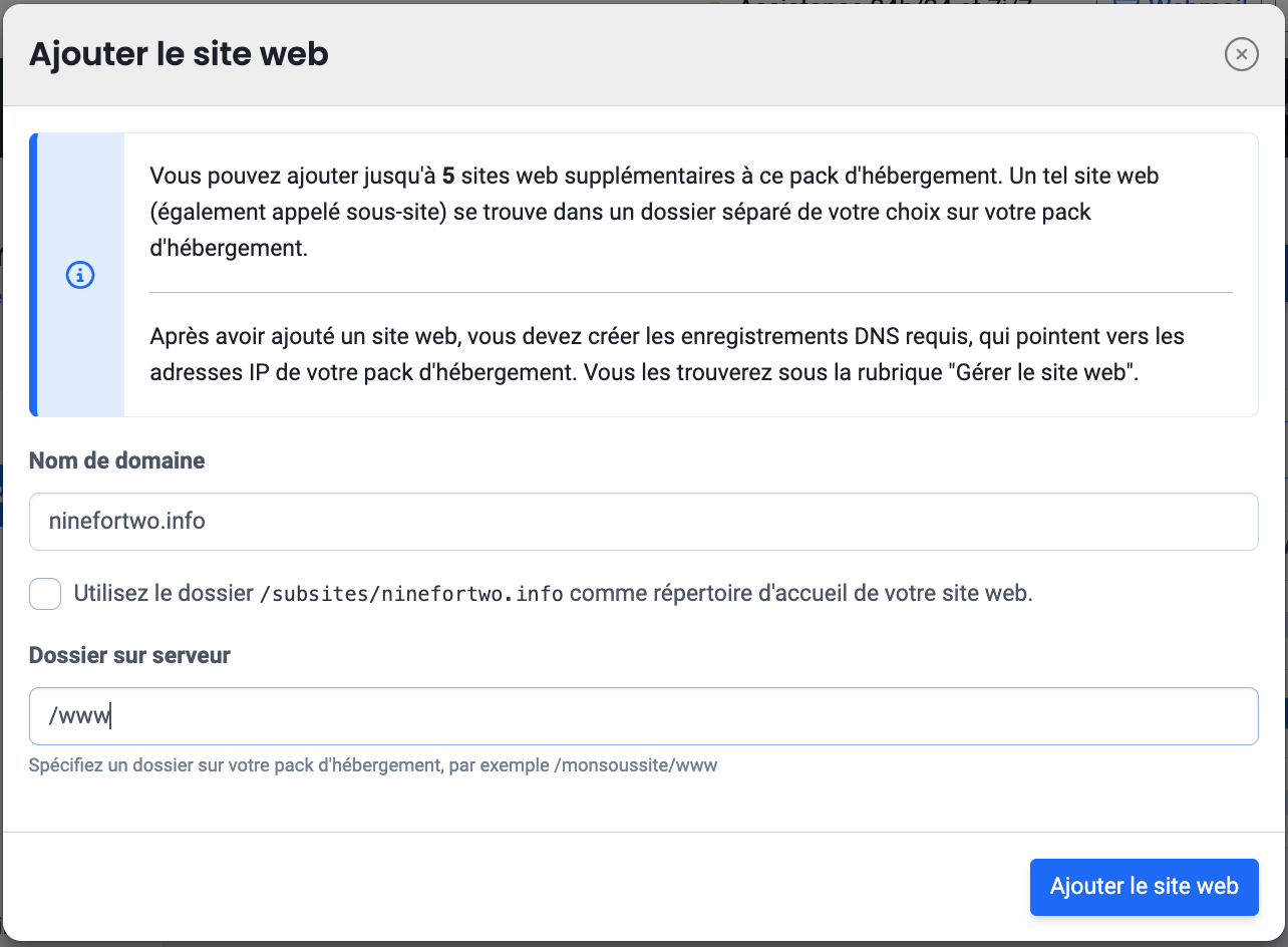 - Créez un site web supplémentaire sur le pack d’hébergement sur lequel tourne votre site web.