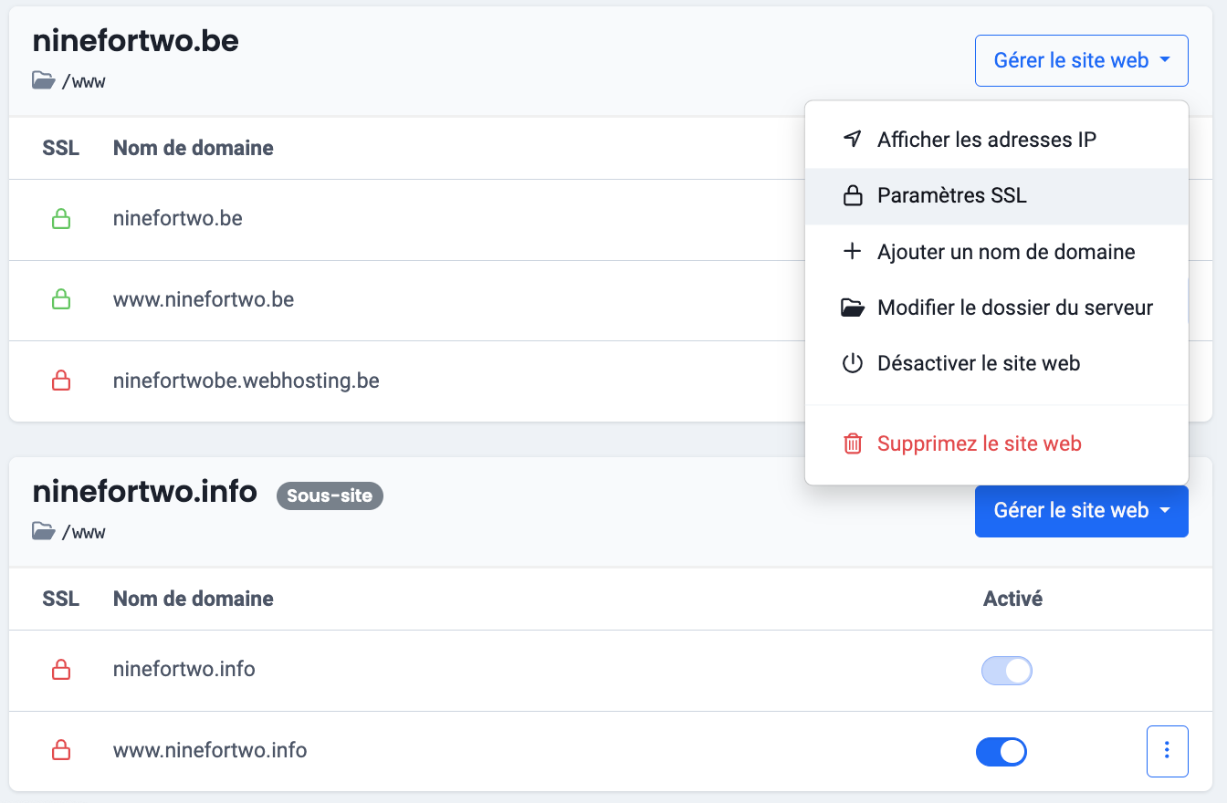 Cette modification peut nécessiter jusqu’à 15 minutes. Après cela, vous pourrez tester le nouveau site web utilisant le protocole HTTPS en saisissant le nom de domaine normal (dans notre cas : ninefortwo.be) dans la barre d’adresse de votre navigateur web.