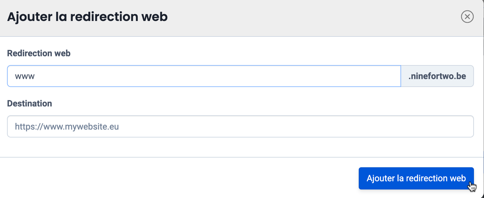 Ou entrez « www » si vous souhaitez rediriger le nom de domaine précédé de www. - Complétez le champ « destination » en y indiquant l’URL vers laquelle votre domaine doit pointer. Exemple : « https://domeinnaam.com ». (Notez que « http:// » ou « https:// » doit être mentionné).