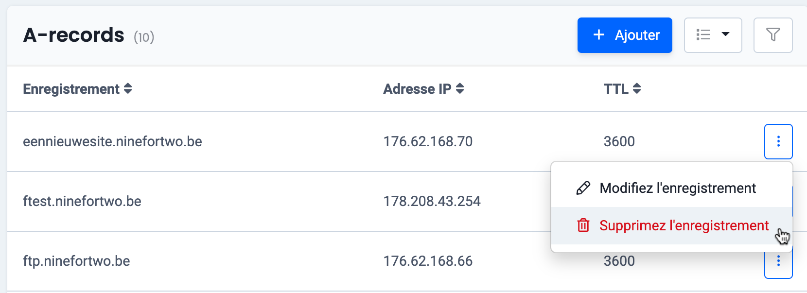 - Vérifiez si un enregistrement A a été créé pour le nom de domaine qui vous intéresse. Si c’est le cas, supprimez-le.