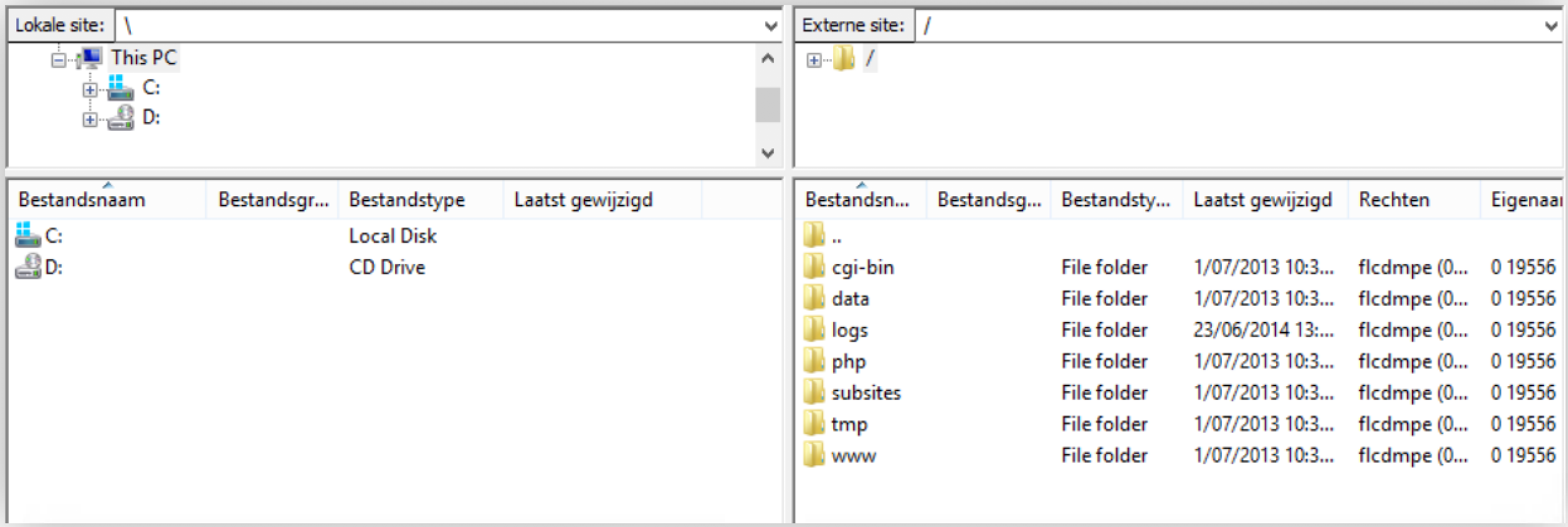 Dans votre client FTP, vous disposez de 2 volets (voir illustration). Dans le premier, vous pouvez voir les fichiers et les dossiers de votre propre ordinateur, et dans le second, ceux de votre pack d’hébergement web.