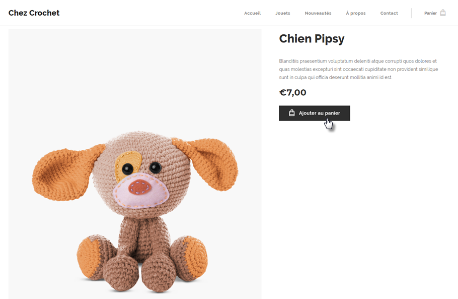 - Lorsqu’un produit attire son attention, il clique dessus. Ainsi, il accède aux détails du produit avec une photo, éventuellement une description détaillée, si vous l’avez ajoutée. S’il décide d’acheter ce produit, il clique sur Ajouter au panier.