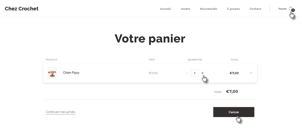 - Pour accéder au panier, le client clique sur le bouton Panier en haut à droite. Il a la possibilité de modifier le nombre de produits commandés ou de vider son panier. Il passe à la commande en appuyant sur Caisse.
