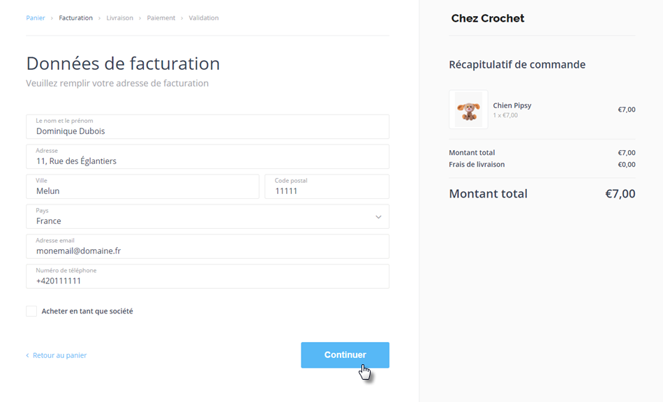 - Dans l’étape suivante, le client renseigne ses coordonnées. S’il effectue l’achat pour une entreprise, il peut cocher la case Acheter en tant que société et remplir ses coordonnées. Pour poursuivre l’achat, le client clique sur Continuer.