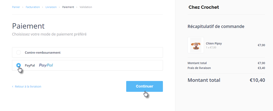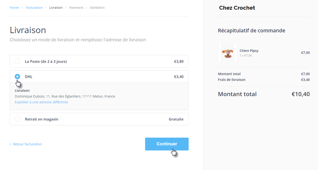 - Ensuite, le client choisit le moyen de livraison. Les frais de livraison seront automatiquement ajoutés au prix du produit. Le client verra le détail du prix et le montant total dans la colonne à droite. Pour confirmer son choix, il clique sur Continuer.