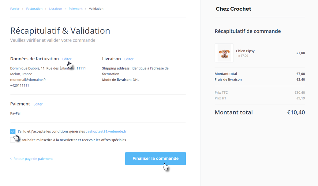- Le client peut vérifier la commande ainsi que les coordonnées renseignées dans la fenêtre avec le récapitulatif. En cas de besoin, il peut également modifier les données en cliquant sur Editer. Avant d’envoyer la commande, il doit cocher la case J’ai lu et j’accepte les conditions générales. Ensuite, il envoie la commande en cliquant sur Finaliser la commande.