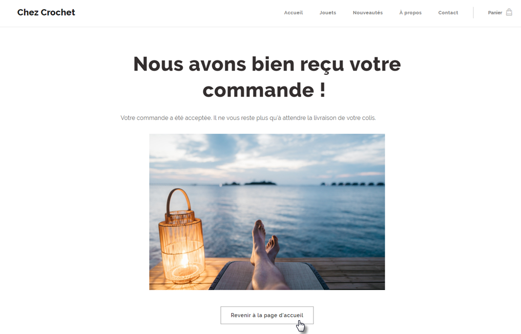 - Une fenêtre avec le message de remerciement pour la commande s’affichera. Le client peut retourner à la page d’accueil en cliquant sur le lien Revenir à la page d’accueil.