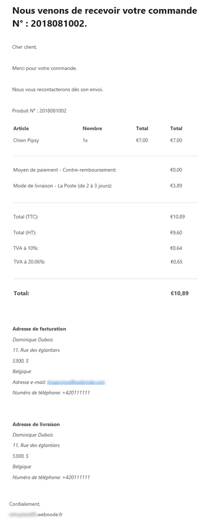 Une confirmation de commande sera automatiquement envoyée à l’adresse mail renseignée par le client lors de l’achat.