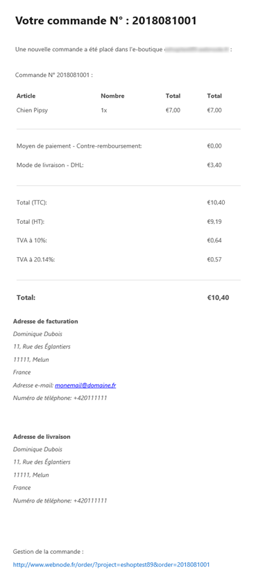 En même temps, une notification de commande sera envoyée à votre adresse mail. Vous y trouverez un lien pour pouvoir accéder à la gestion de la commande.