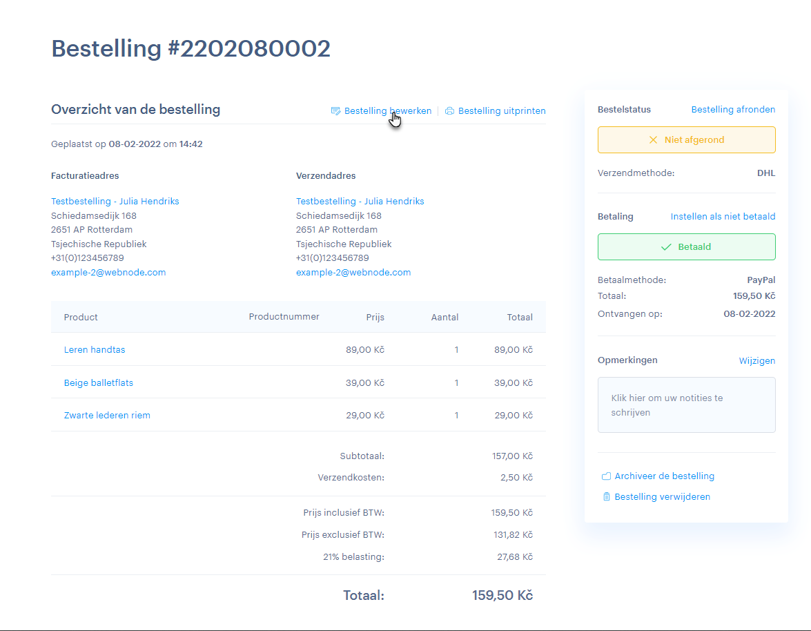- Bovenaan vind je twee kolommen. De linkerkolom geeft alle gegevens over de klant weer, in de rechterkolom staan de gegevens over de bestelling.