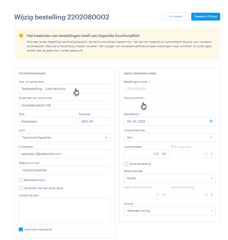 De bestelling blijft meestal onbetaald en moet dan handmatig als betaald gemarkeerd worden (maar het geld wordt niet verzonden en de klant ontvangt zelfs geen e-mail). Het handmatig aanmaken van bestellingen wordt vooral gebruikt voor statistische en boekhoudkundige doeleinden van je online winkel.