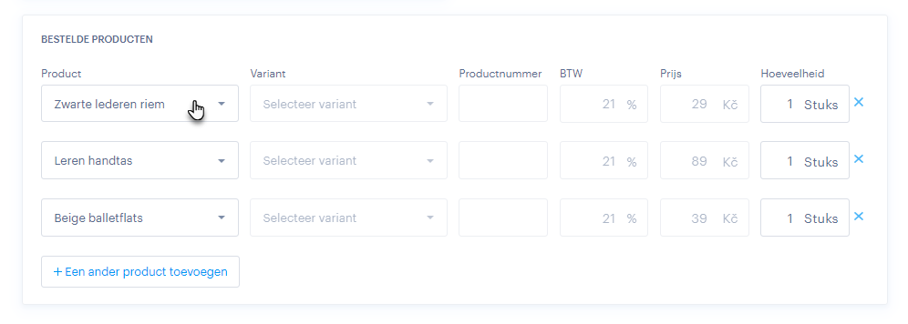 TIP: Als je meer dan één taal hebt ingesteld in de e-shop, verschijnt het taalveld ook in de linkerkolom. Deze eigenschap kan de verschijning van sommige velden in verschillende talen beïnvloeden, zoals ID en BTW nummers in sommige landen. - Onderaan staat informatie over de bestelde producten. Hier kun je producten, varianten en aantal stuks toevoegen. Als je een beperkt aantal stuks voor het product hebt ingesteld, wordt het product standaard van dit aantal afgetrokken.