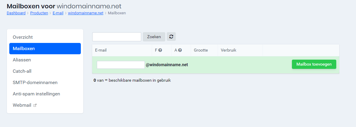 Zie je de knop “Toevoegen” niet staan, dan heb je geen beschikbare mailbox. Je zal er eerst eentje moeten bestellen.
