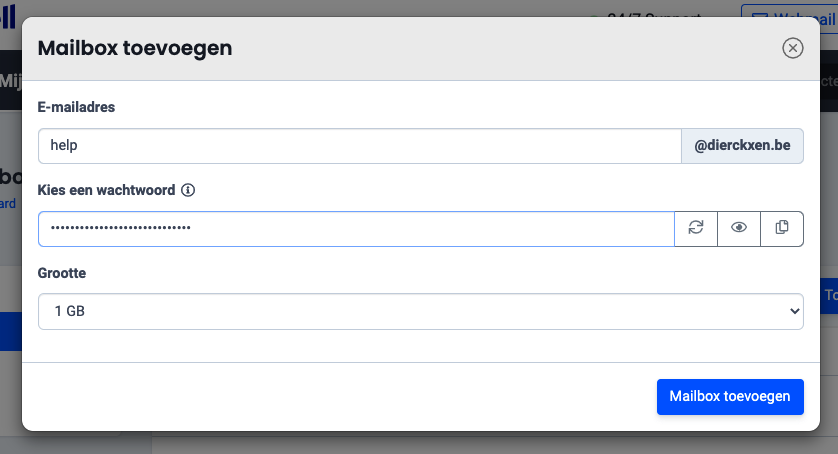 - Vul je gewenste e-mailadres in. Kies een wachtwoord en selecteer de gewenste grootte. Klik op “Mailbox toevoegen” om de mailbox aan te maken.