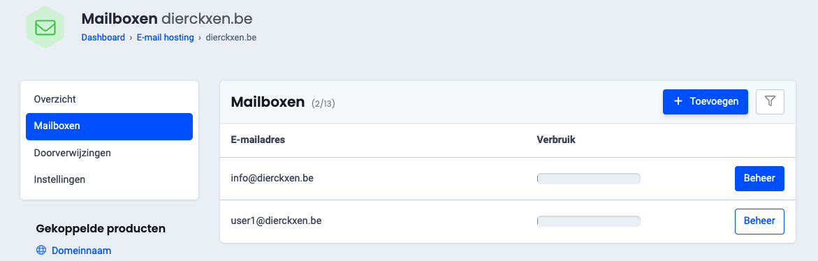 2. Kies in het menu links voor “Mailboxen” en klik op “Beheer” bij de gewenste mailbox.
