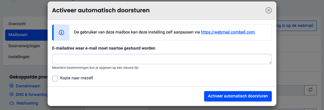 Met een Basic mailbox voeg je een autoforward toe via het controlepaneel of de webmail.