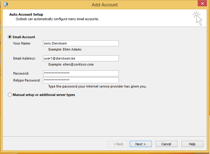 Klik op “Volgende” om verder te gaan. Outlook zal trachten om jouw mailbox automatisch te configureren. Automatische configuratie niet gelukt? Dan moet je de configuratie manueel afronden.
