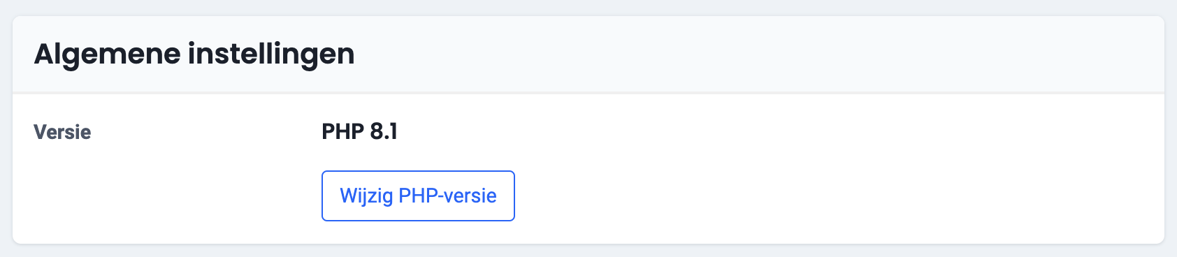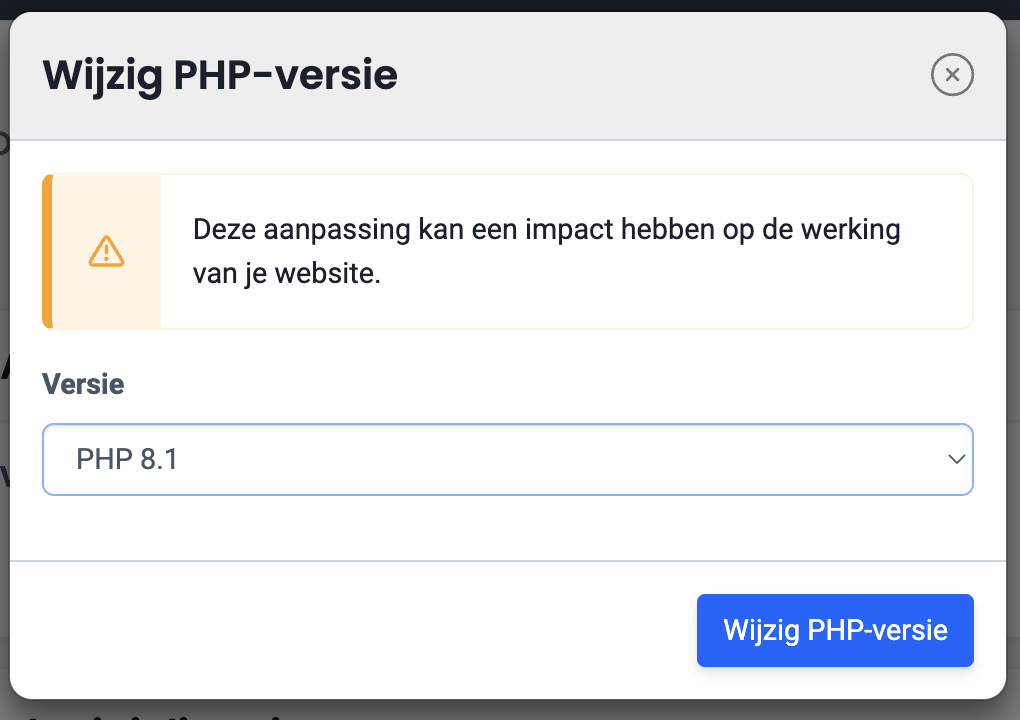 - Klik bovenaan op “Wijzig PHP-versie” om een pop-upvenster te openen. Kies in de dropdown de gewenste versie van PHP en sla je wijzigingen op.
