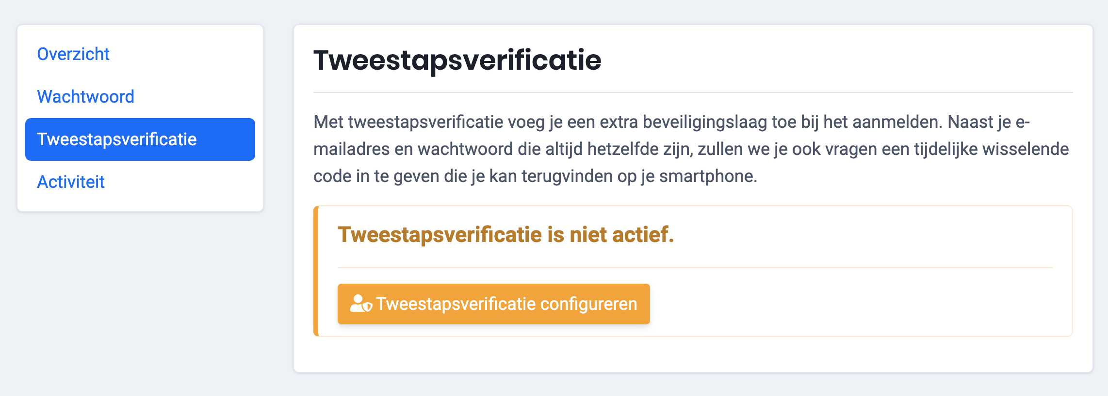 Met tweestapsverificatie (two-factor authentication of 2FA) voeg je een extra beveiligingslaag toe aan jouw login. Op je smartphone krijg je dan een code die je moet ingeven om in te loggen. Op die manier is je account nog beter beveiligd.