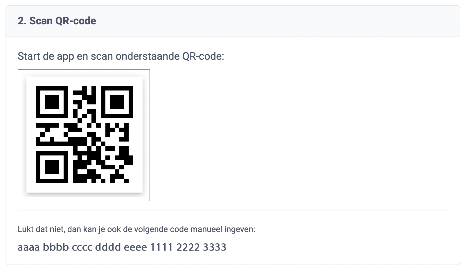 - Scan de QR-code met de app die je hebt gekozen. Lukt het niet om te scannen, geef dan de alfanumerieke reeks in.