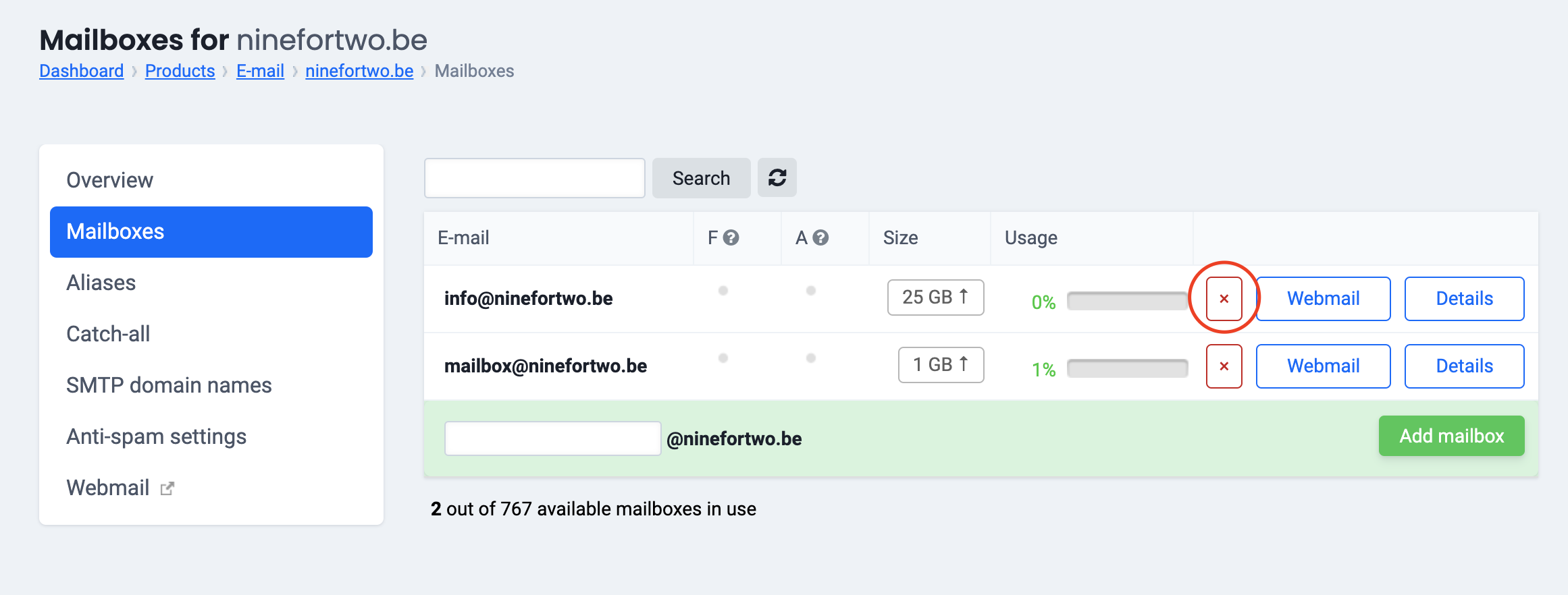 - Scroll naar onderen en klik op de rode knop “Verwijder mailbox”. Bevestig nogmaals en de mailbox is verwijderd.