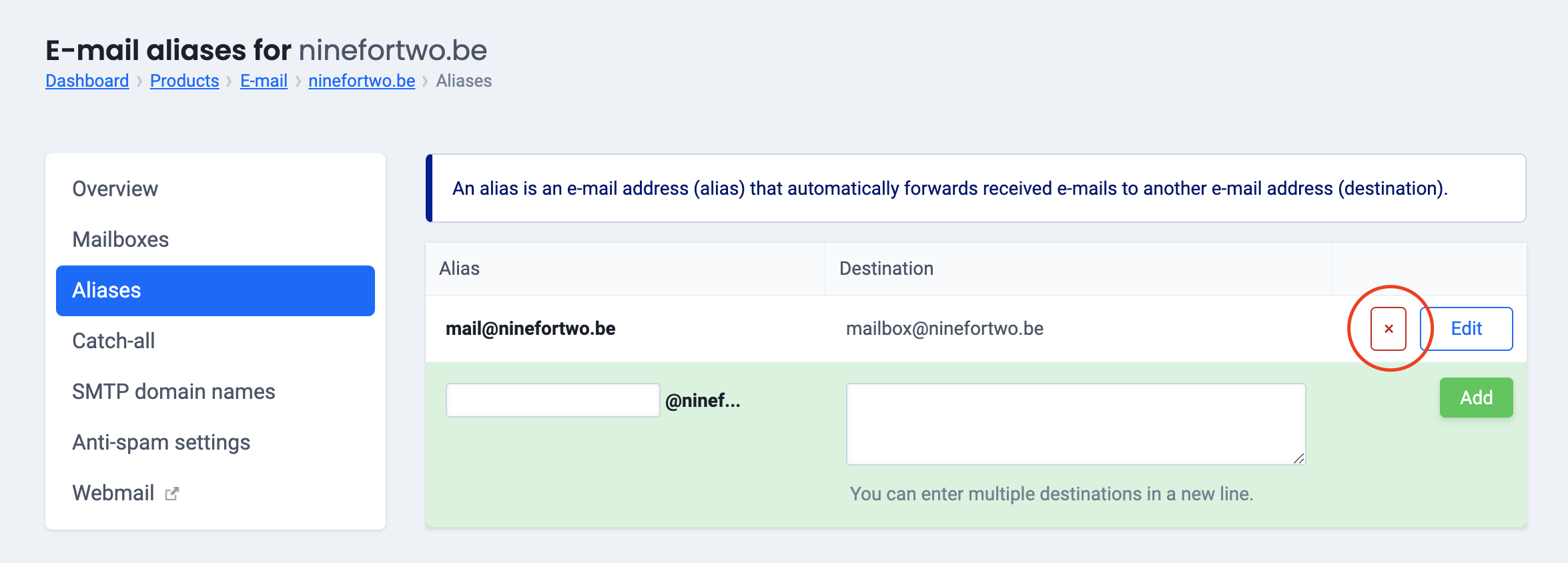 Een e-mailadres met doorverwijzing (alias) verwijderen