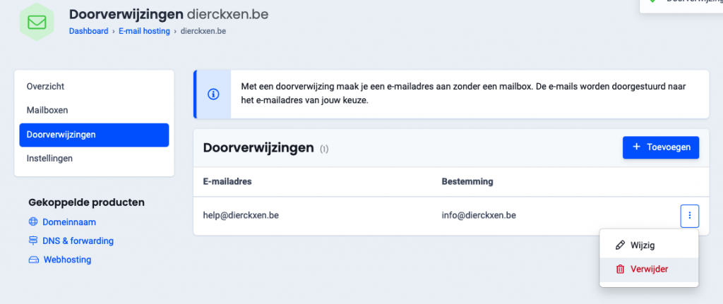 - Ga naar “Mijn producten” > “E-mailhosting” > klik op “Beheren” naast het domein waarvoor je een contact wilt verwijderen.