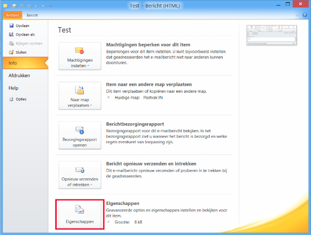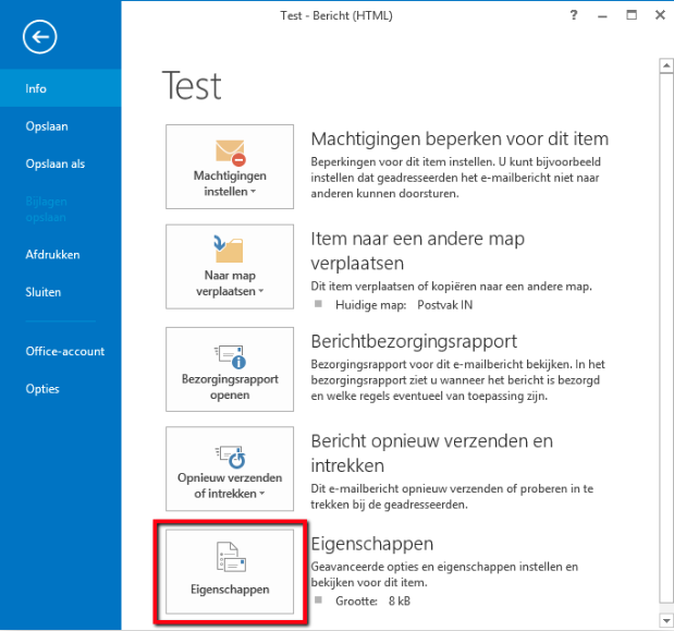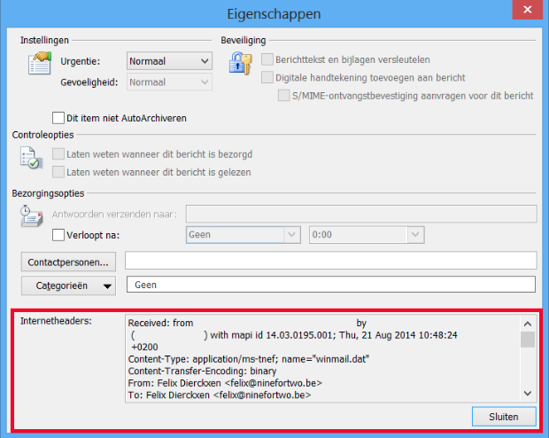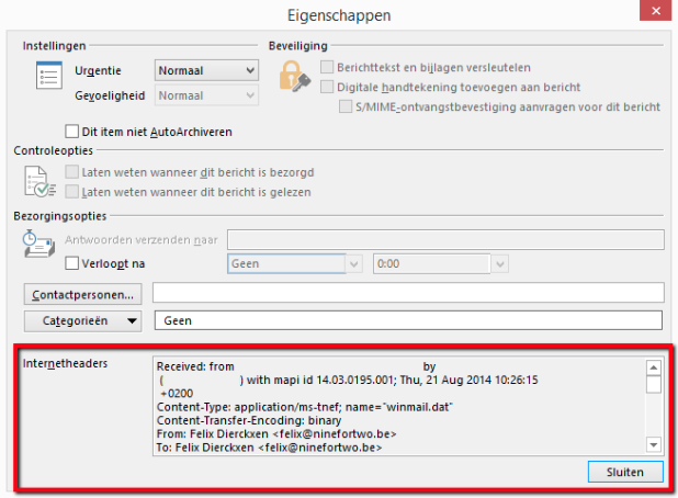 - Onderaan in het dialoogvenster “Eigenschappen” vind je de mail header onder “internetheaders” (zie afbeelding).